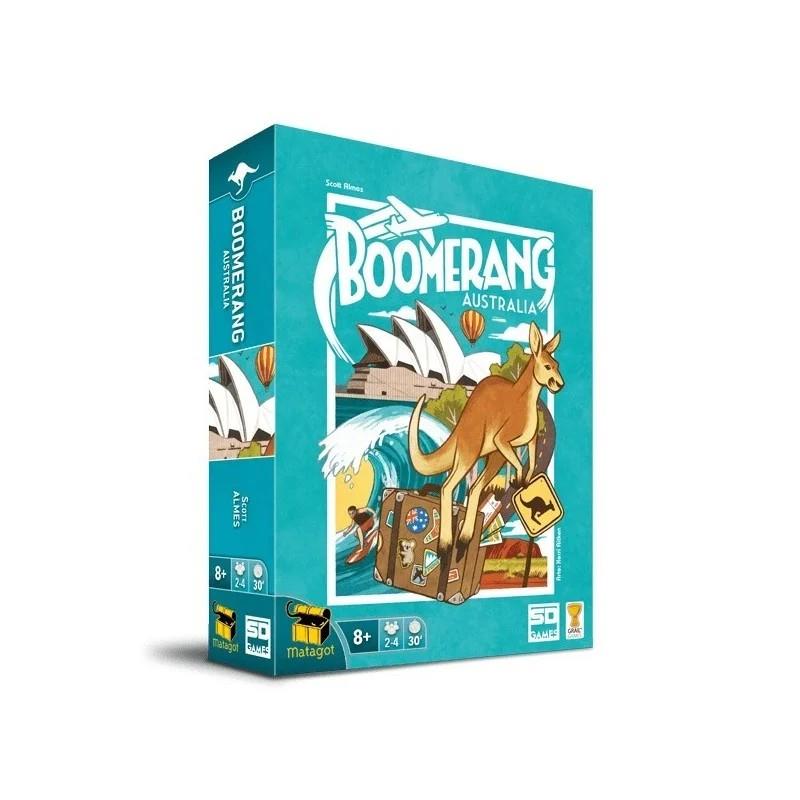 Bienvenidos a Boomerang! En este juego viajaréis a Australia, donde intentaréis ver y hacer todo lo posible antes de que terminen vuestras vacaciones. Obtendréis puntos por avistar animales autóctonos, coleccionar piezas de Australiana y realizar diferentes actividades vacacionales. En cada ronda, los jugadores seleccionarán cartas e irán anotando logros en sus hojas de puntuación. Al final de la partida, el mejor viajero será el ganador. Disfrutad del paisaje! COMPONENTES: 28 Cartas 4 Lápices 1 Bloc de Puntuación Edad Recomendada : 8+ Duración Partida: 30 min. Jugadores: 2 a 4