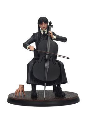 Déjate encantar por la figura de Wednesday Addams inspirada en la serie de Tim Burton y magníficamente interpretada por Jenna Ortega! Esta figura captura una escena mágica donde Wednesday interpreta magistralmente la canción Paint it Black de los Rolling Stones con su violonchelo desde su balcón, envuelta en la atmósfera misteriosa donde observamos todos los acontecimientos que la rodean. Vestida con su conjunto característico de zapatos negros, falda larga, chaqueta a rayas gris oscuro, chaleco de punto negro, camisa blanca y corbata negra, el peinado distintivo de Wednesday, con su flequillo y dos trenzas largas, junto con las uñas pintadas de negro, se suman al estilo único de esta pieza. encanto. Y, por supuesto, está acompañada por el guardián de la familia Addams, Thing, con sus intrincados bordados a su costado. Esta figura es imprescindible para todos los fanáticos!